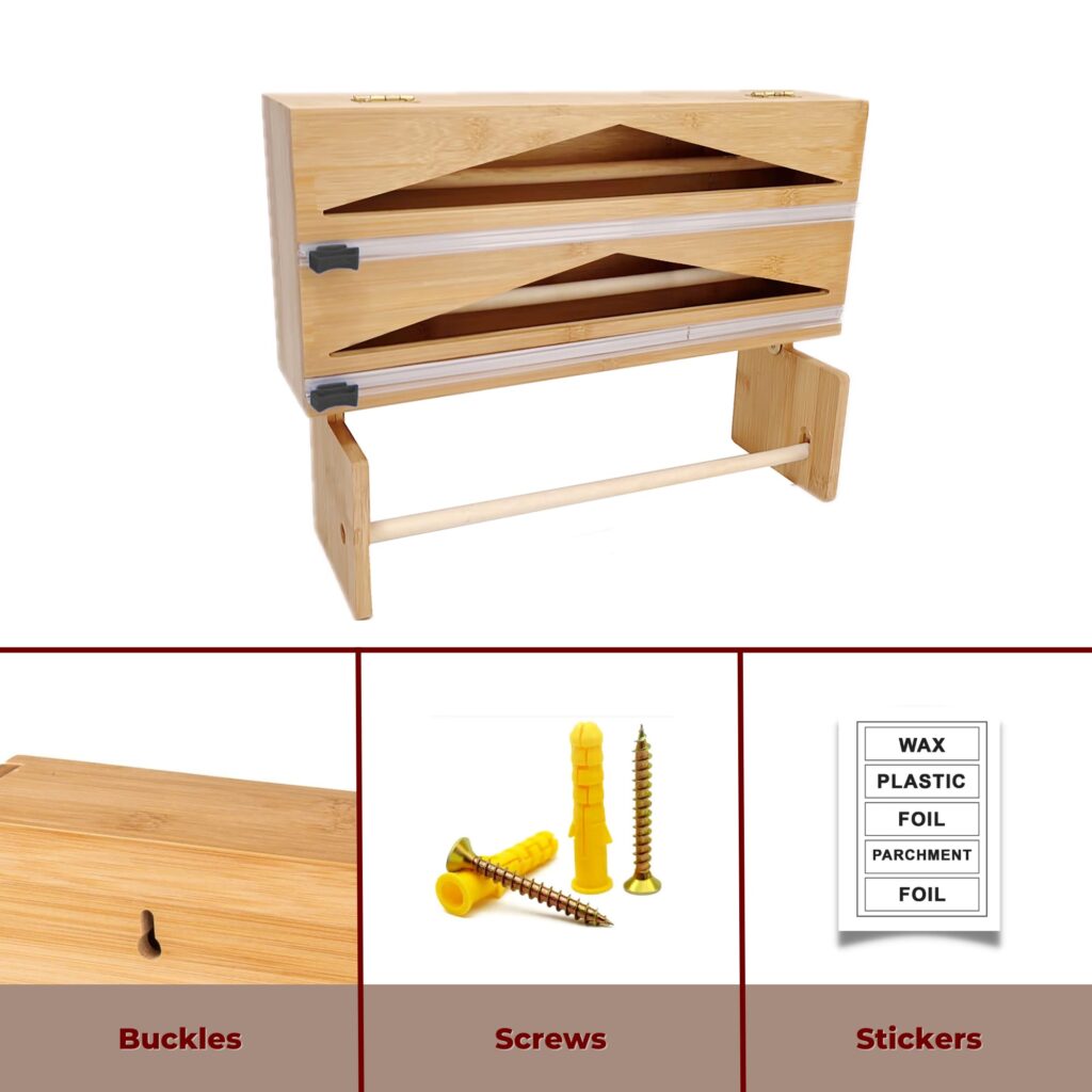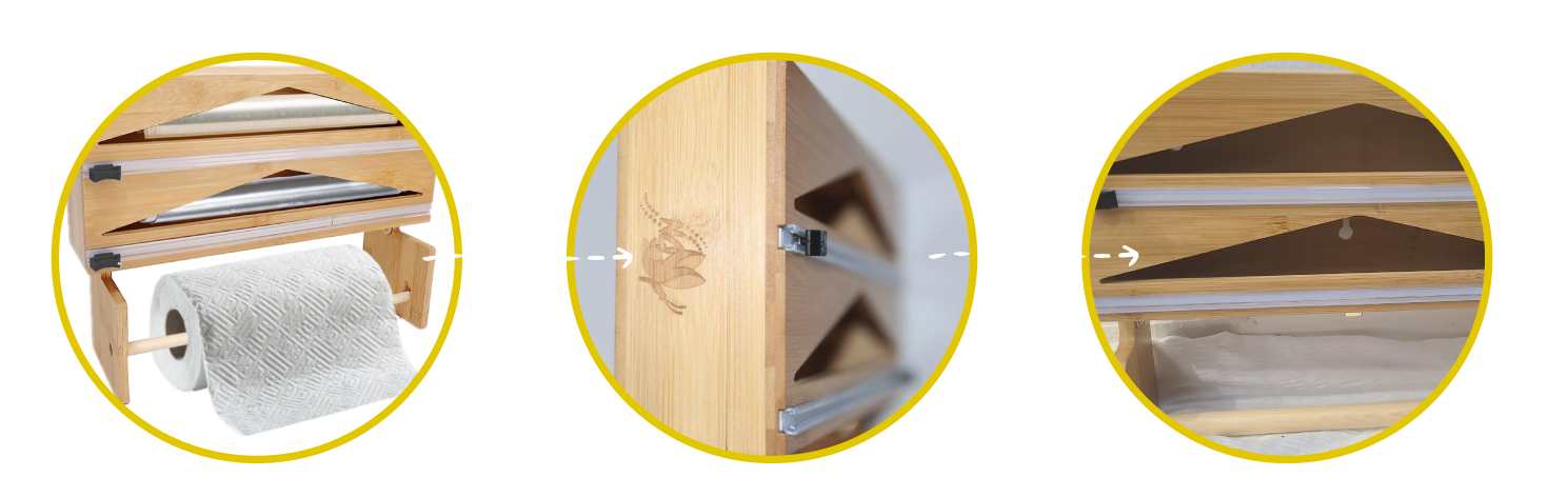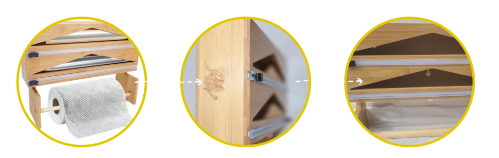 Organiza tus rollos de papel film, aluminio y servilletas en un solo lugar con nuestro Dispensador Premium de Bambú. Práctico, elegante y diseñado para durar.